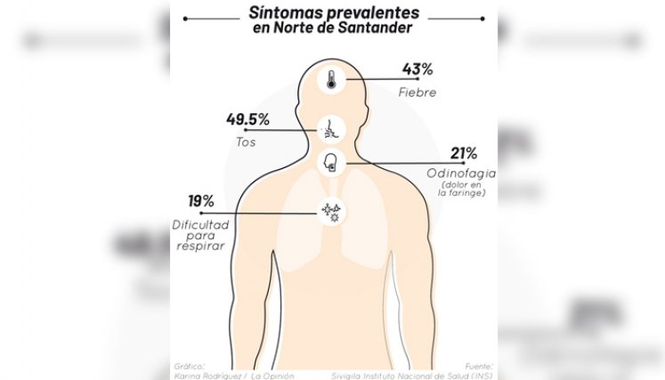 En el caso de Norte de Santander, existe una prevalencia en tos del 49.5%, de fiebre de un 43%, de dificultad para respirar de un 19% y un 21% registró odinofagia (dolor en la faringe) y tan solo un 1% son asintomáticos.